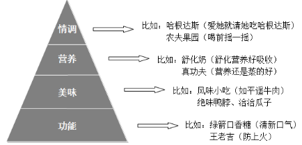 如上圖所示,這可以說是馬斯洛需求層次理論在食品行業(yè)中深度的實踐版。從消費者需求層次層面來劃分的話,食品的價值屬性由低到高可歸結(jié)為四類:功能、美味、營養(yǎng)和情調(diào)。