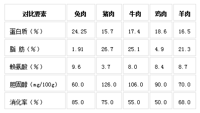 現(xiàn)代科學(xué)研究表明,兔肉營養(yǎng)價值豐富,纖維細(xì)嫩,味道鮮美,適合現(xiàn)代生活對肉質(zhì)的要求。兔肉具有高蛋白(含蛋白質(zhì)21~23%)、高賴氨酸(賴氨酸占蛋白質(zhì)的9.6%)、高消化率(達(dá)85%)、高煙酸(高達(dá)12.8毫克/百克);低脂肪(僅為4.9%)、低膽固醇(為65毫克/百克)、低脲酸、低熱量等特點。因此,兔肉自古以來便享有“葷中之素”的美稱。
