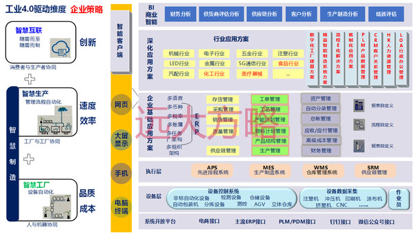 遠(yuǎn)大方略科技智能制造事業(yè)部,具有制造業(yè)自主知識產(chǎn)權(quán)的國產(chǎn)自主軟件:ERP、MES、WMS、APS,并能與各主流ERP系統(tǒng)集成,打通企業(yè)內(nèi)部信息系統(tǒng),并能與外部系統(tǒng)進(jìn)行集成(CRM、SRM)