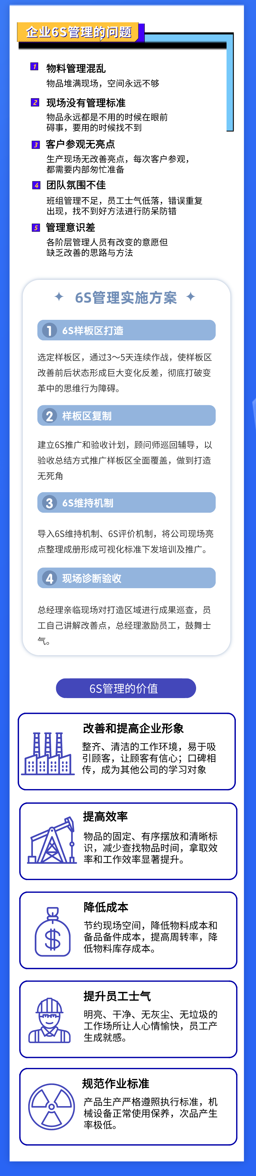 去除混亂與浪費,創(chuàng)造一個明亮的整潔環(huán)境;提升企業(yè)形象,提高生產(chǎn)效率,減少浪費,降低成本。