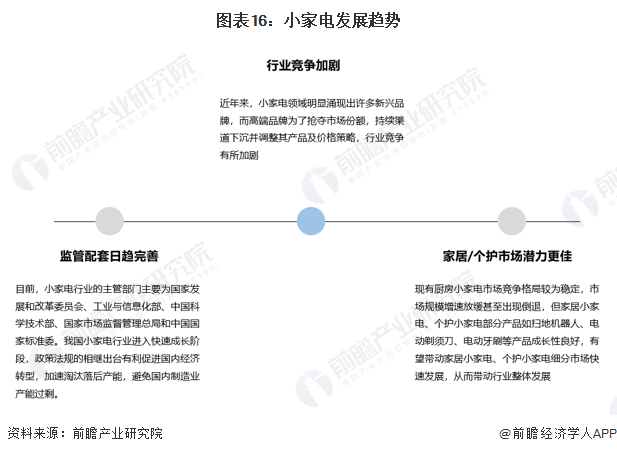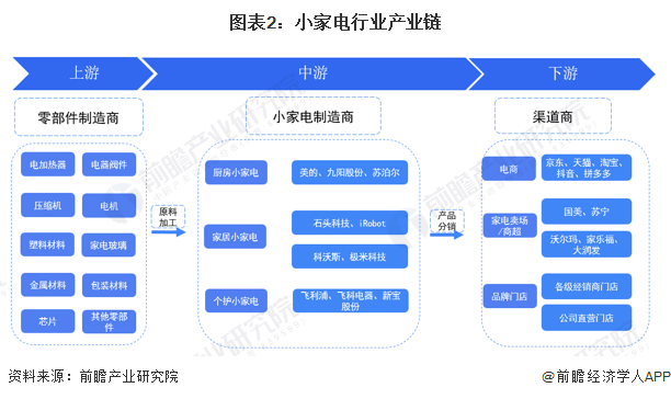 小家電產(chǎn)業(yè)鏈主要分為上游原材料和零部件供應(yīng)、中游小家電制造和下游小家電銷(xiāo)售三大環(huán)節(jié)。小家電行業(yè)上游原材料和零部件包括電加熱器、電器閥件、塑料、金屬材料、包裝材料等各類(lèi)零部件供應(yīng)商,由于各種不同小家電所需原材料零部件不同,因此上游覆蓋企業(yè)范圍較廣,品牌也較多元化;中游小家電制造企業(yè)包含了國(guó)外大企業(yè)(如飛利浦)和國(guó)內(nèi)家電綜合制造企業(yè)(如美的)、小家電制造企業(yè)各類(lèi)型企業(yè);下游主流銷(xiāo)售渠道有綜合電商平臺(tái)(如天貓商城、京東商城等)、線下家電賣(mài)場(chǎng)(如蘇寧、國(guó)美)、大型商超、各級(jí)經(jīng)銷(xiāo)商門(mén)店、公司直營(yíng)門(mén)店等各類(lèi)分銷(xiāo)渠道。