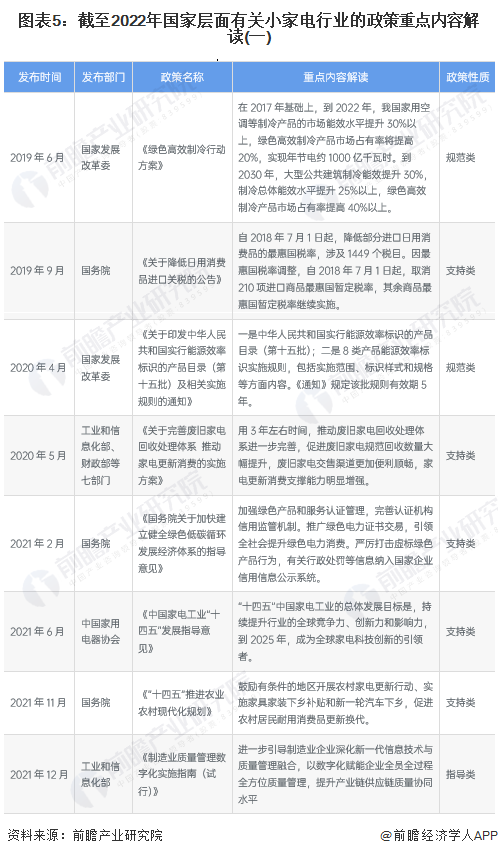2022年1月,國(guó)家發(fā)改委擬定《關(guān)于做好近期促進(jìn)消費(fèi)工作的通知》,鼓勵(lì)有條件的地方開(kāi)展綠色智能家電下鄉(xiāng),通過(guò)企業(yè)讓利、降低首付比例等方式,促進(jìn)農(nóng)村居民消費(fèi)。支持家電、家具等企業(yè)開(kāi)展“以舊換新”、“以換代棄”活動(dòng),加強(qiáng)家電安全使用年限標(biāo)準(zhǔn)等宣傳解讀,鼓勵(lì)家電合理更新。2022年一季度,中國(guó)境內(nèi)零星爆發(fā)新型冠狀肺炎疫情導(dǎo)致經(jīng)濟(jì)增長(zhǎng)受阻,國(guó)務(wù)院也于2022年5月制定了一攬子穩(wěn)住經(jīng)濟(jì)的政策措施,其中提及穩(wěn)定家電產(chǎn)品的消費(fèi)。總結(jié)梳理來(lái)看,近年來(lái)國(guó)家層面對(duì)于小家電行業(yè)的政策關(guān)鍵詞在于:新一輪家電下鄉(xiāng)、以舊換新、補(bǔ)貼消費(fèi)、家電回收。