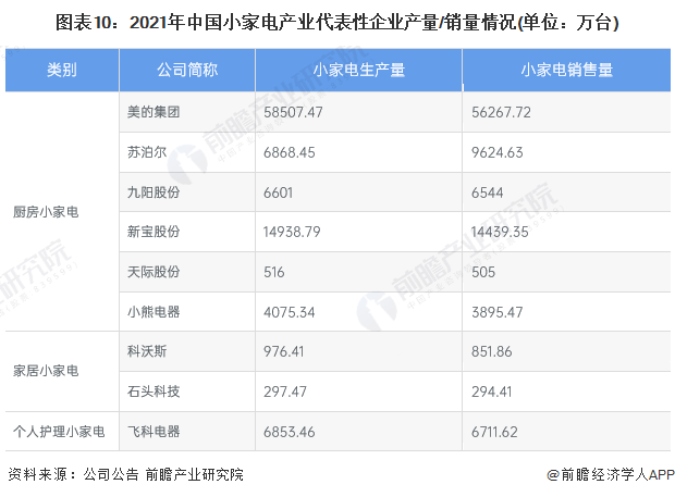 2021年,布局了小家電制造的上市企業(yè)中,美的集團(tuán)、蘇泊爾、九陽(yáng)股份、新寶股份、小熊電器、飛科電器的企業(yè)產(chǎn)量均在4000萬(wàn)臺(tái)以上,規(guī)模較大,其中美的集團(tuán)家電產(chǎn)品產(chǎn)量達(dá)到5.85億臺(tái),產(chǎn)量規(guī)模位居全國(guó)第一。從產(chǎn)銷(xiāo)率來(lái)看,多數(shù)企業(yè)基本達(dá)到產(chǎn)銷(xiāo)平衡的狀態(tài),蘇泊爾呈現(xiàn)供不應(yīng)求的局面,其部分產(chǎn)能需要通過(guò)代工方式進(jìn)行補(bǔ)充。小家電產(chǎn)業(yè)的代表性企業(yè)產(chǎn)量/銷(xiāo)量情況如下:
