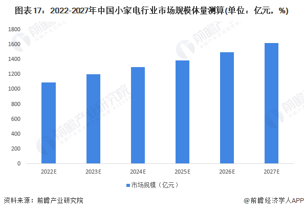 2021年,由于原材料價(jià)格上漲、宅經(jīng)濟(jì)減弱、上年市場(chǎng)規(guī)模基數(shù)較大等原因,中國(guó)小家電行業(yè)整體市場(chǎng)規(guī)模增速僅為0.99%,市場(chǎng)規(guī)模達(dá)到1017億元。展望未來(lái),廚房小家電目前市場(chǎng)規(guī)模占據(jù)了小家電行業(yè)“半壁江山”,但行業(yè)、產(chǎn)品較為成熟,競(jìng)爭(zhēng)格局穩(wěn)定,廚房小家電未來(lái)增速有所放緩;而家居小家電、個(gè)護(hù)小家電領(lǐng)域,在消費(fèi)升級(jí)的刺激下,產(chǎn)品也不斷創(chuàng)新升級(jí),推陳出新滿(mǎn)足當(dāng)下需求熱點(diǎn),行業(yè)競(jìng)爭(zhēng)較為充分,行業(yè)整體成長(zhǎng)性良好,未來(lái)行業(yè)將保持中高增速。經(jīng)初步測(cè)算,2027年,中國(guó)小家電行業(yè)市場(chǎng)規(guī)模約為1611億元。