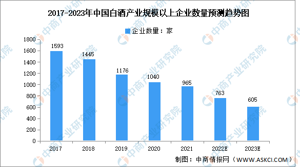 我國白酒產業規模以上企業數量呈下降趨勢,由2017年的1593家降至2021年的965家,現有企業競爭激烈,白酒產業集中度進一步提升。預計2023年我國白酒產業規模以上企業數量605家。