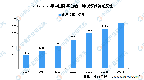 陳年白酒是由具備白酒生產資質企業以傳統白酒工藝釀造,出廠10年以上,且保存完好的白酒產品。近年來,茅臺酒、五糧液、汾酒、瀘州老窖特曲等品牌的陳年酒市場規模高速增長,由2017年的370億元增長至2021年的1000億元,復合年均增長率達28.2%。未來,隨著國民消費水平進一步提高,預計2023年我國陳年白酒市場規模將達1285億元。
