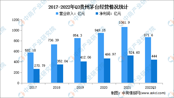 貴州茅臺主導產品“貴州茅臺酒”是世界三大蒸餾名酒之一,也是集國家地理標志產品、有機食品和國家非物質文化遺產于一身的白酒品牌。2021年,貴州茅臺累計實現白酒產量17.1萬噸,實現營業收入1061.9億元,凈利潤達524.6億元。2022年前三季度實現營業收入871.6億元,凈利潤444億元。