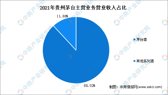 從主營產品來看,2021年貴州茅臺主營產品茅臺酒營業收入為934.65億元,占比88.02%。