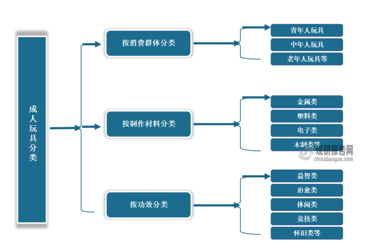 成人玩具按消費群體分類,成人玩具可分為青年人玩具、中年人玩具、老年人玩具等;按制作材料分類,可分為金屬類、塑料類、電子類、木制類等;按功效分類,可分為益智類、治愈類、休閑類、競技類、懷舊類等,其中主要以休閑、益智為主。