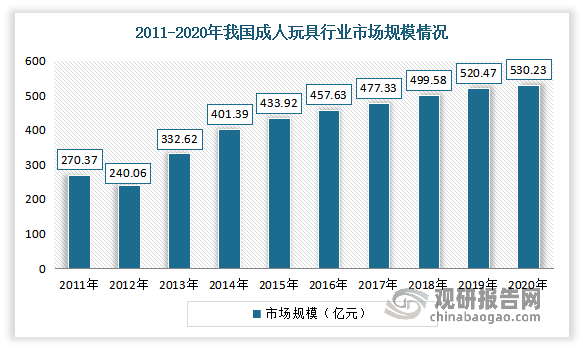 近年隨著我國經(jīng)濟的發(fā)展和居民生活水平的提高,居民開始注重精神層面的追求,玩具消費的群體正在從兒童拓展到成年人,更多高檔、新穎的玩具逐漸成為成年人的消費首選,促使成人玩具消費規(guī)模迅速壯大。數(shù)據(jù)顯示,2020年我國成人玩具行業(yè)市場規(guī)模由2011年的270.37億元增長至530.23億元。